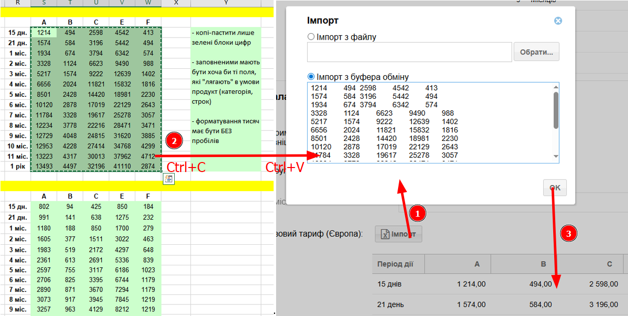 При виборі редакції полісів 2024 року доступна можливість внесення значень базових тарифів/платежів в розрізі кожної територій покриття окремо ("Європа" та "Молдова, Азербайджан") вручну в самій табличці/гріді або через імпорт* файлу Exel або через копіювання таблиці тарифів у "Буфері обміну".